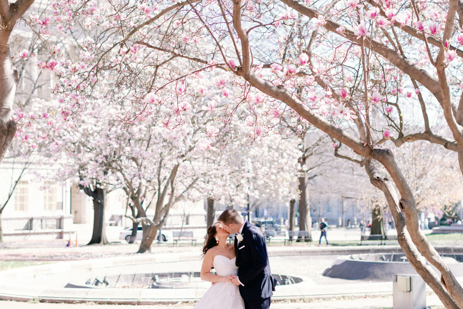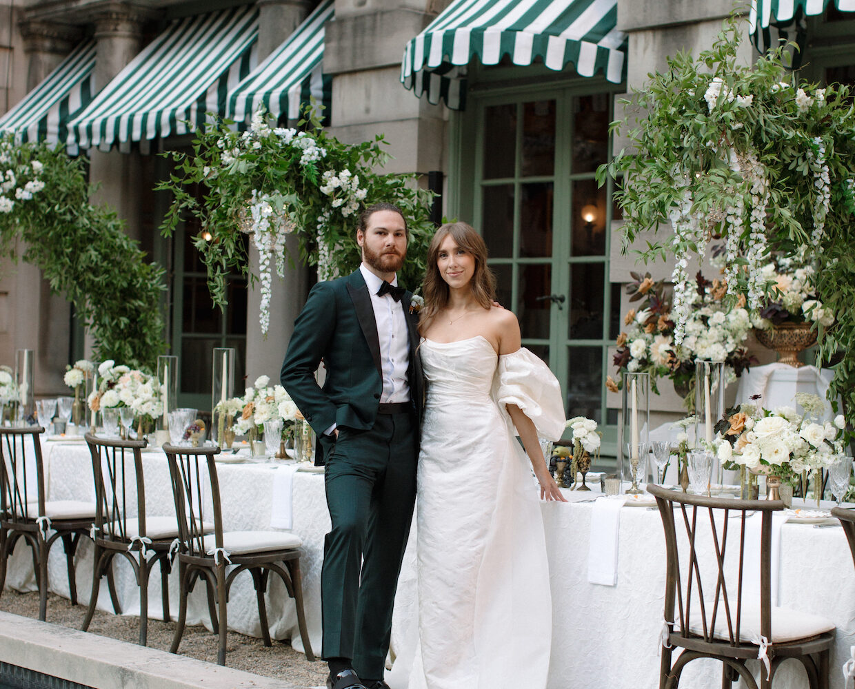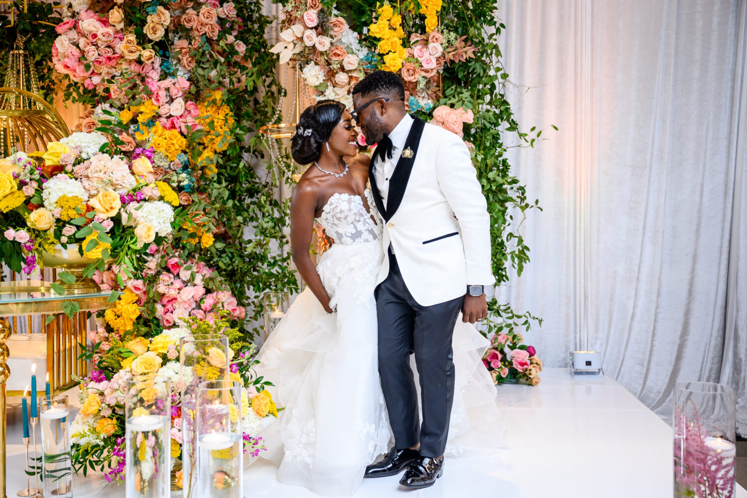 At their spring-themed wedding last June, the design included light colors—including lilac, gray, and cream—and floral patterns. Food was important, so they wanted for a restaurant venue, and chose La Vie, where they dined on brunch—including chicken and waffles, shrimp and grits, steak and eggs, Greek salad, seasonal fruit, and more—with a waterfront view. Following the big day, the newlyweds honeymooned in the Bahamas.