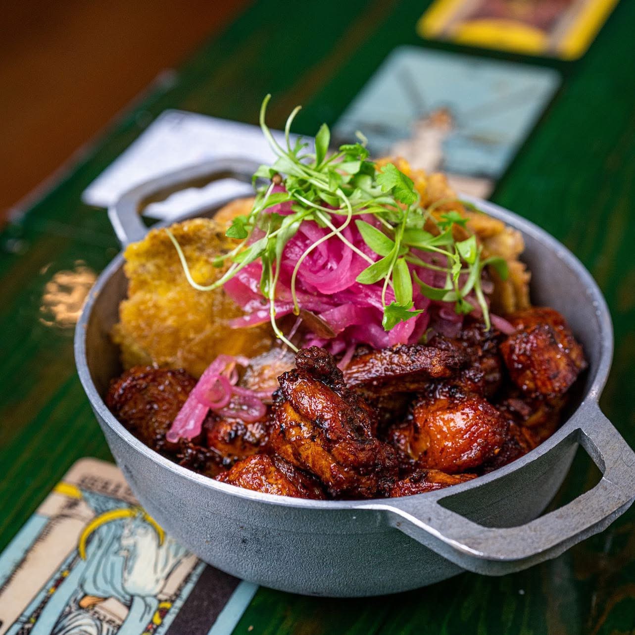 Mendez’s menu remains homey and traditional, spanning the breadth of Puerto Rican cooking. There are small bites like ceviche and octopus salad, and fried items like meat-filled pastelillos and salt-cod bacalaítos. Mofongo (garlicky smashed plantains) can be topped with shrimp, fried pork, or stewed pigeon peas. And the signature dish at Qui Qui is the chuleta kan-kan (a huge fried tomahawk pork chop). As much as any of these dishes though, Mendez continues to be proud of his simple stewed habichuelas (red beans), a Puerto Rican staple. “It takes you back home,” he says.