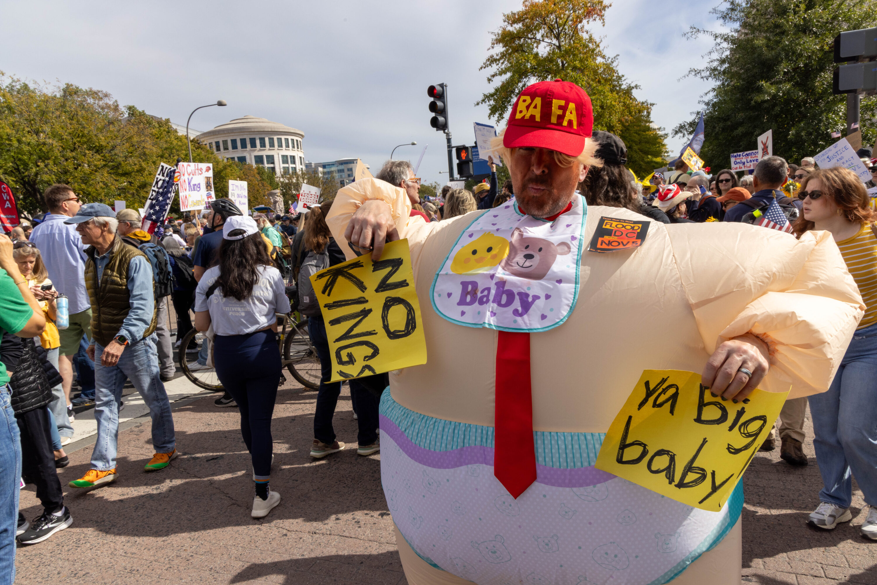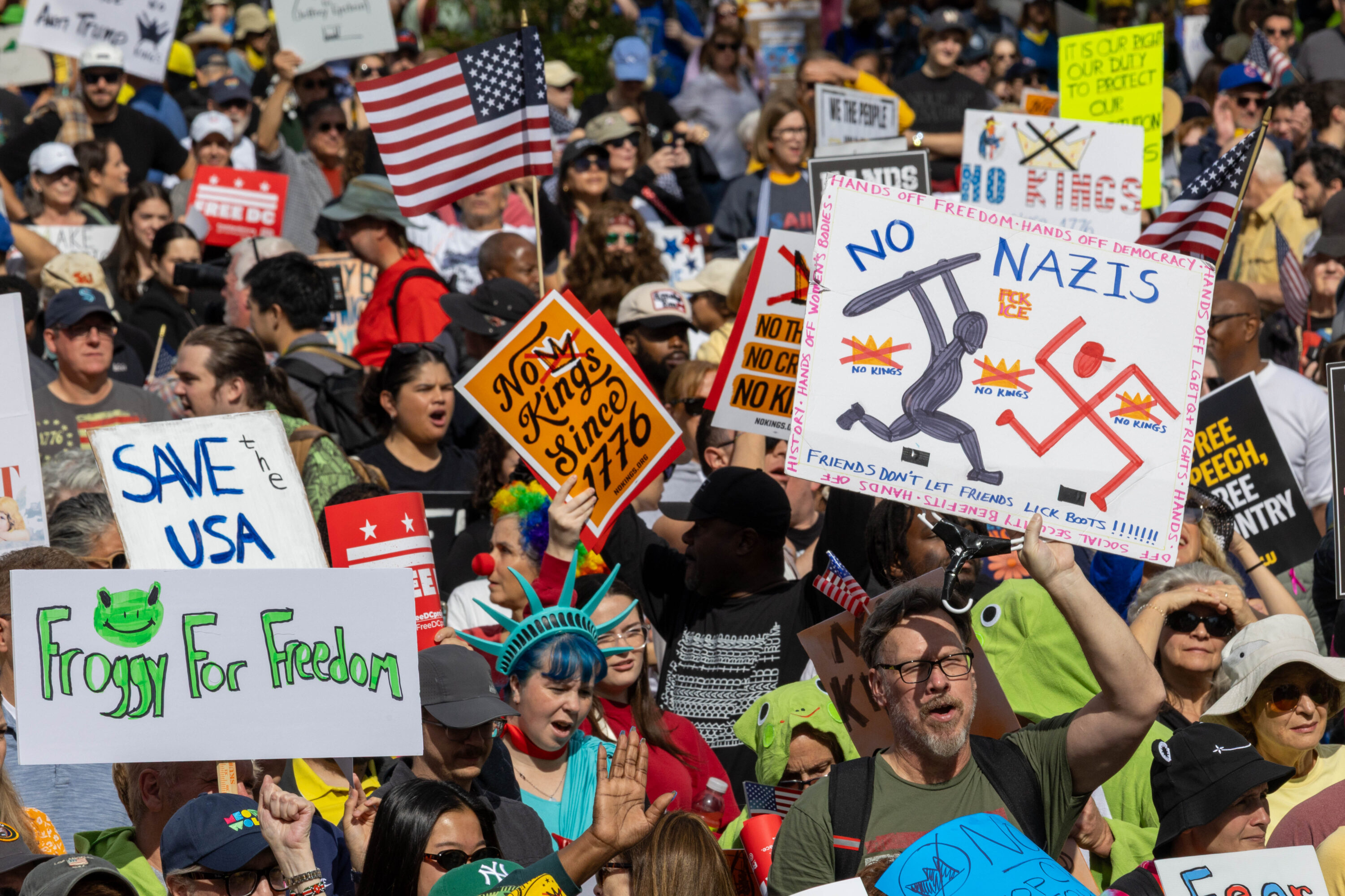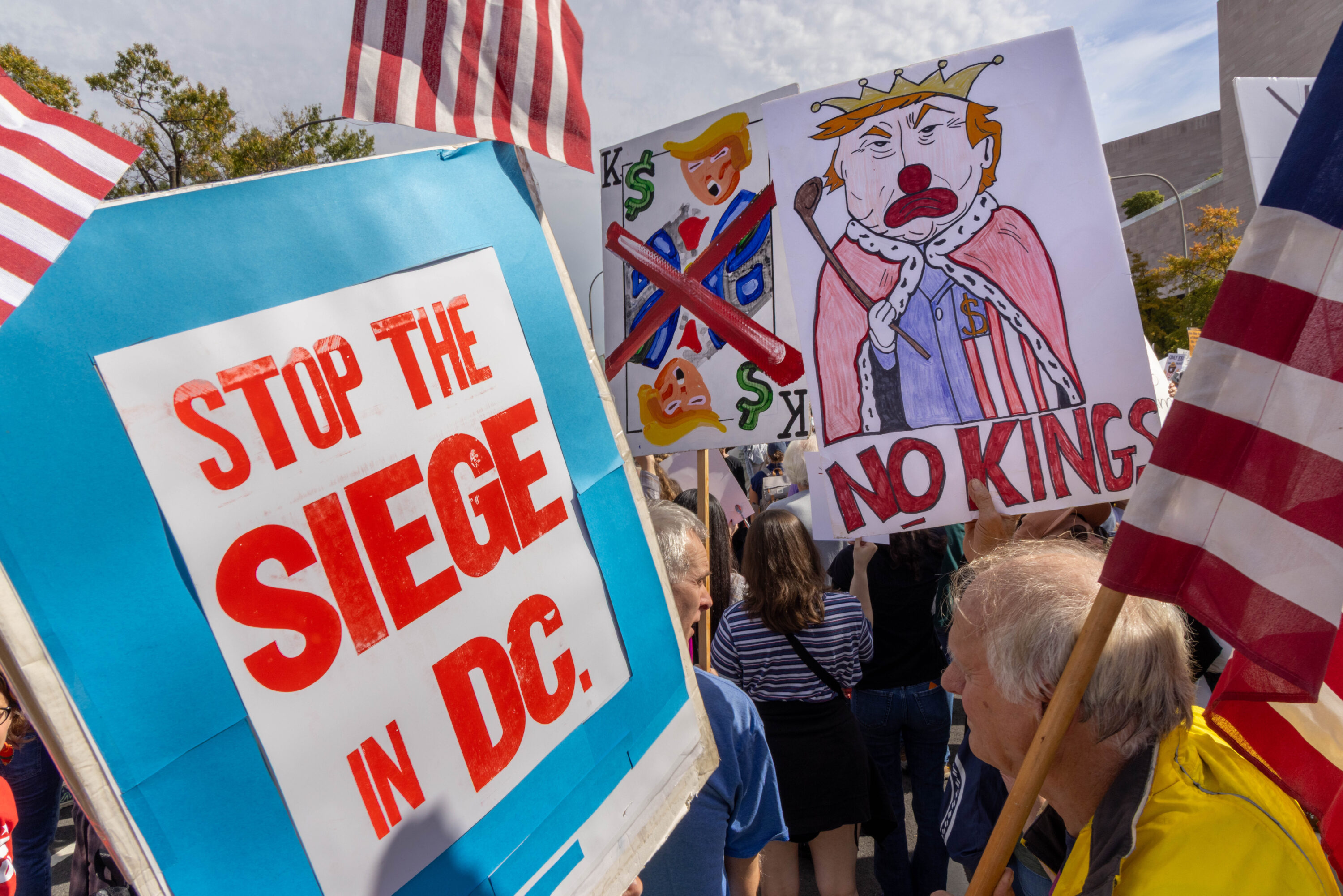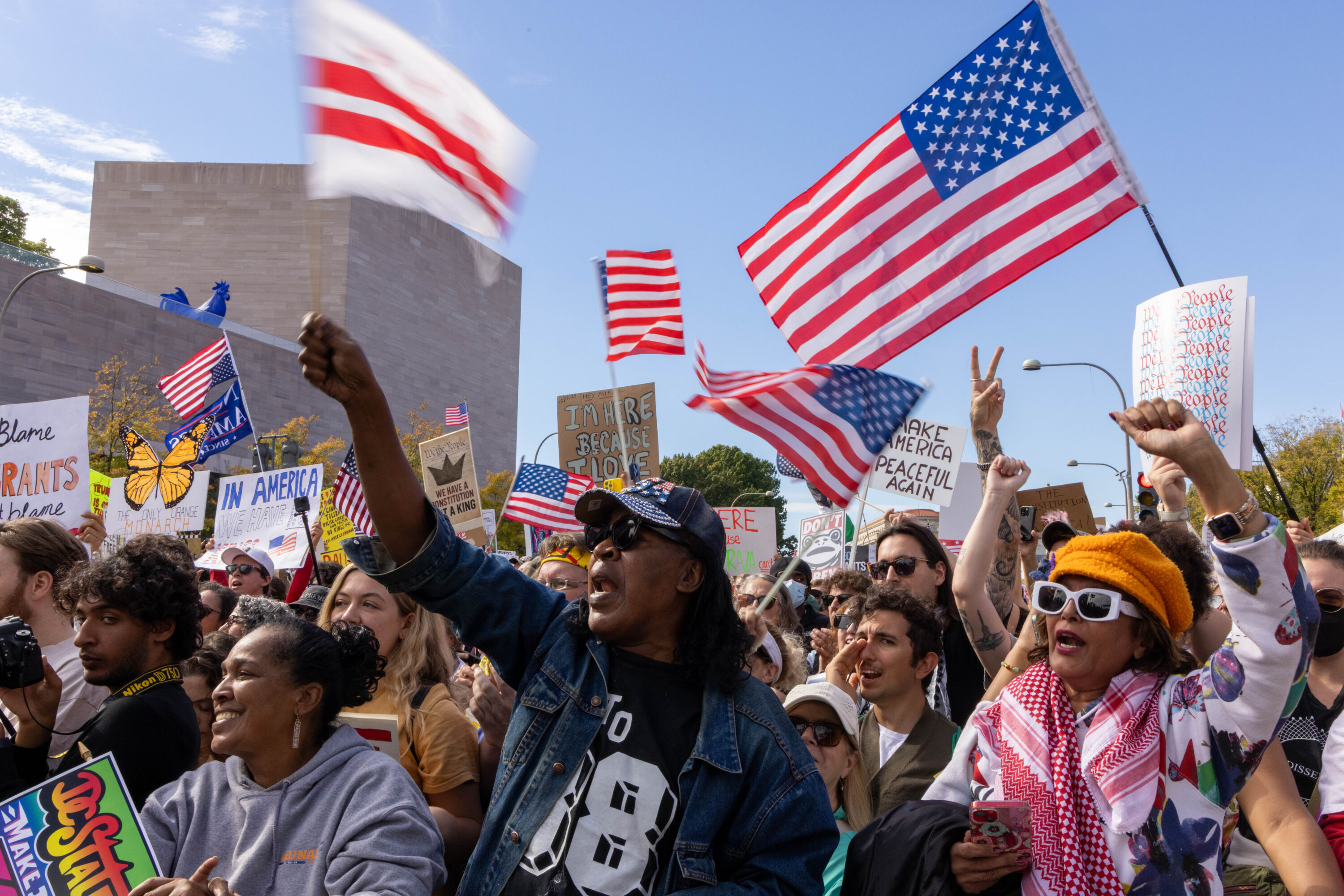 Carrying signs that were at times deadly serious (“Evil Wins When Good People Do Nothing,” “Stop Kidnapping People”) and other times mocking (“Cleanup on Aisle 47,” “Elect a Clown, Expect a Circus”), an estimated 200,000 protesters filled Pennsylvania Avenue and surrounding DC streets on Saturday, October 18, for the second No Kings day of action this year.