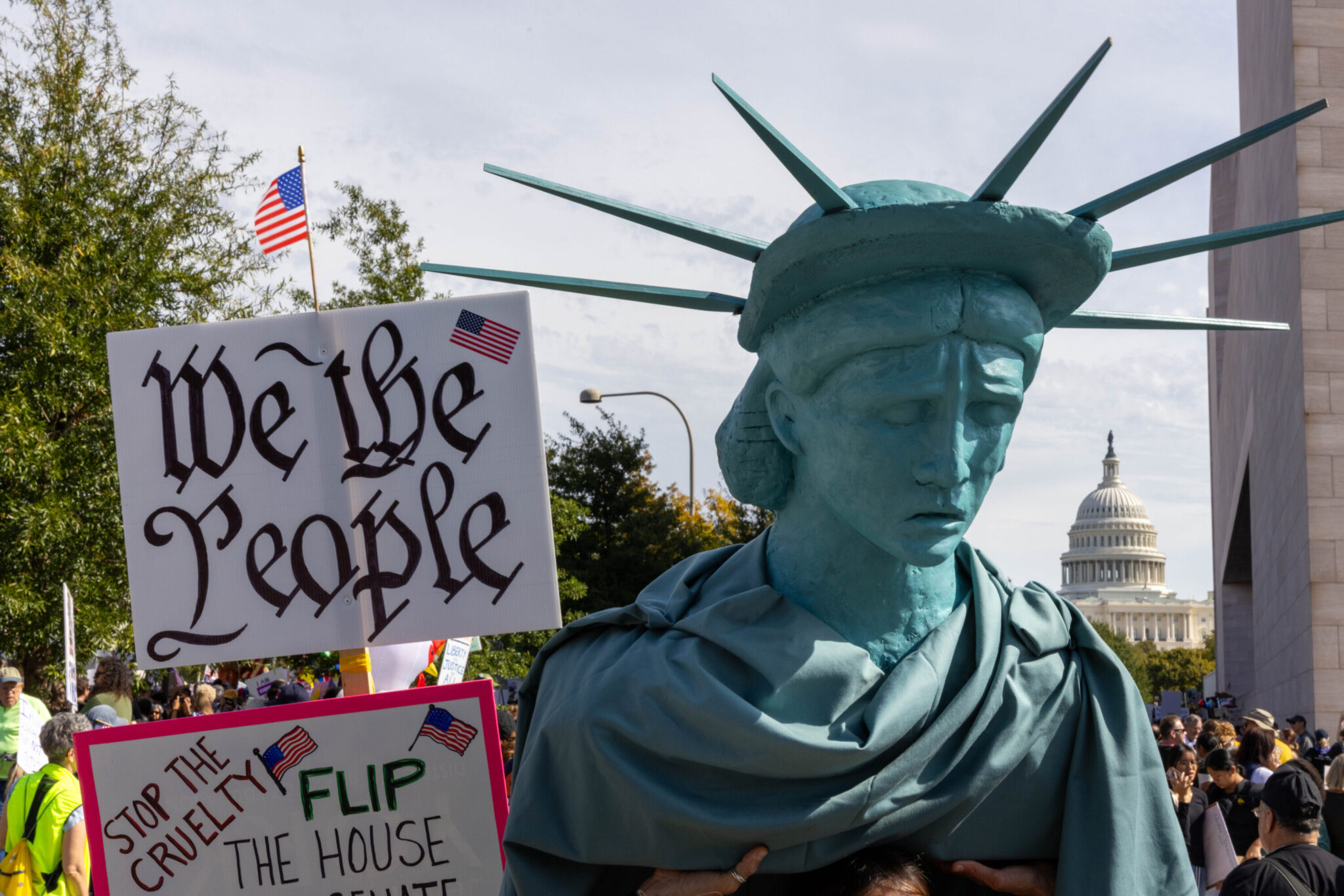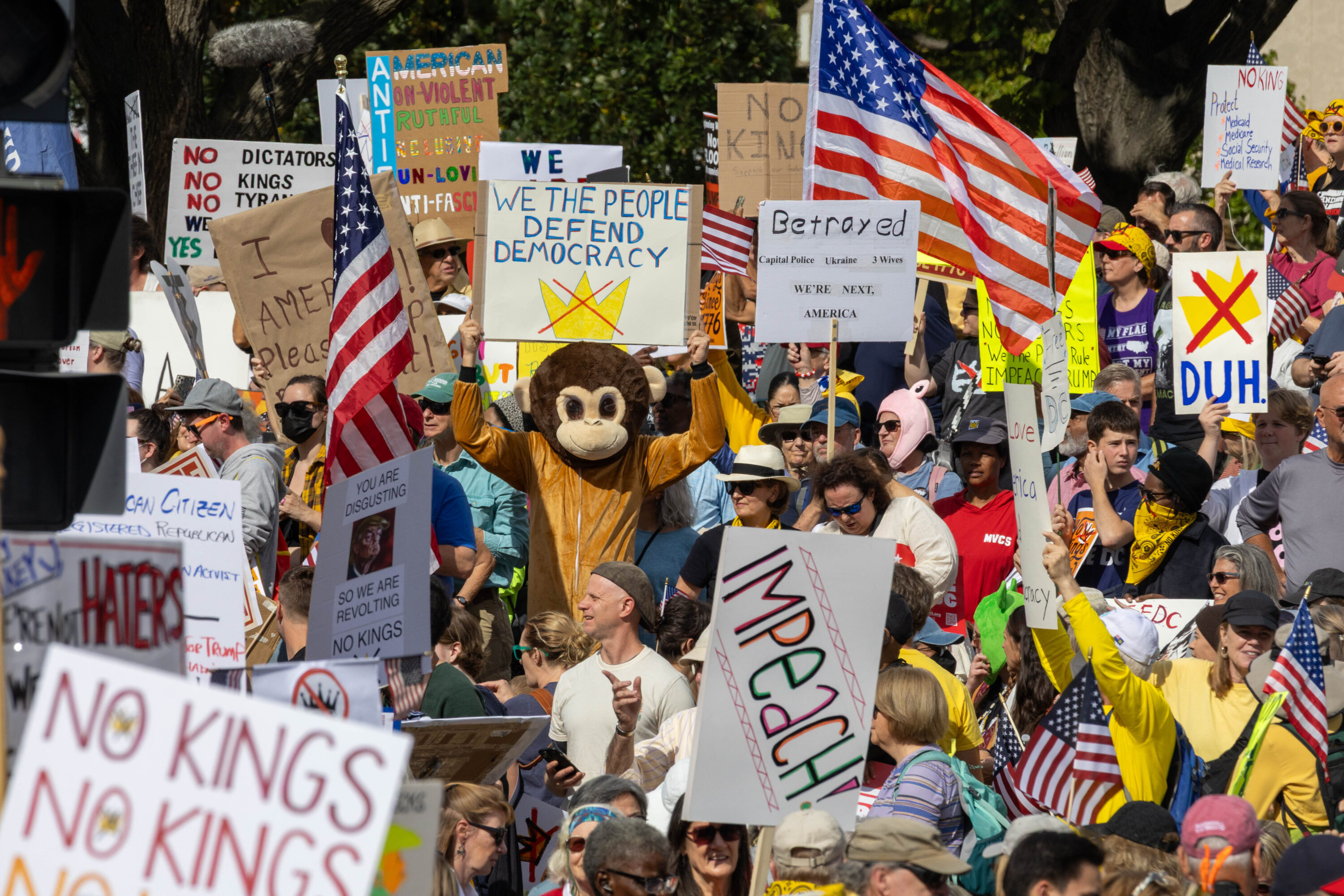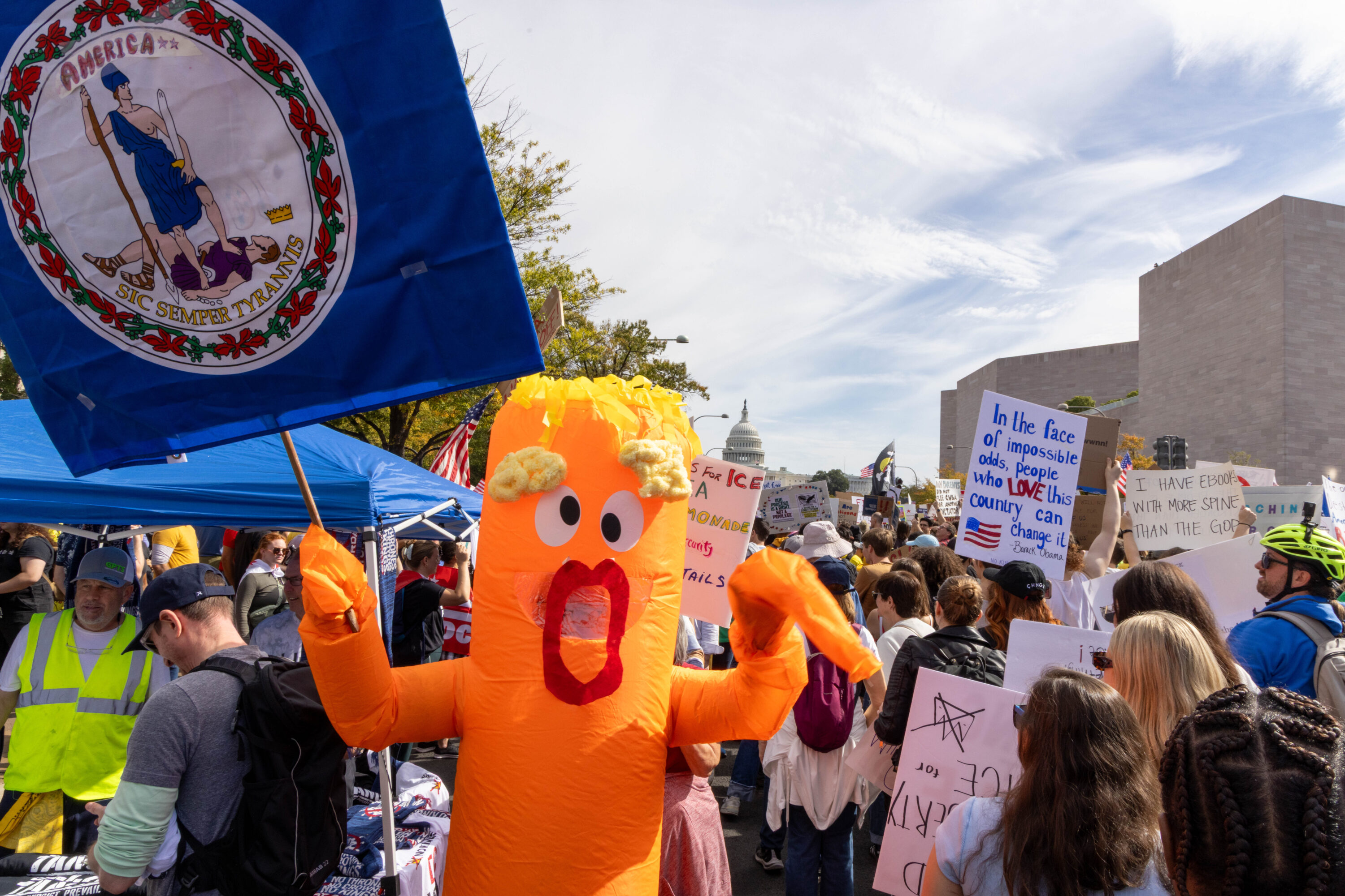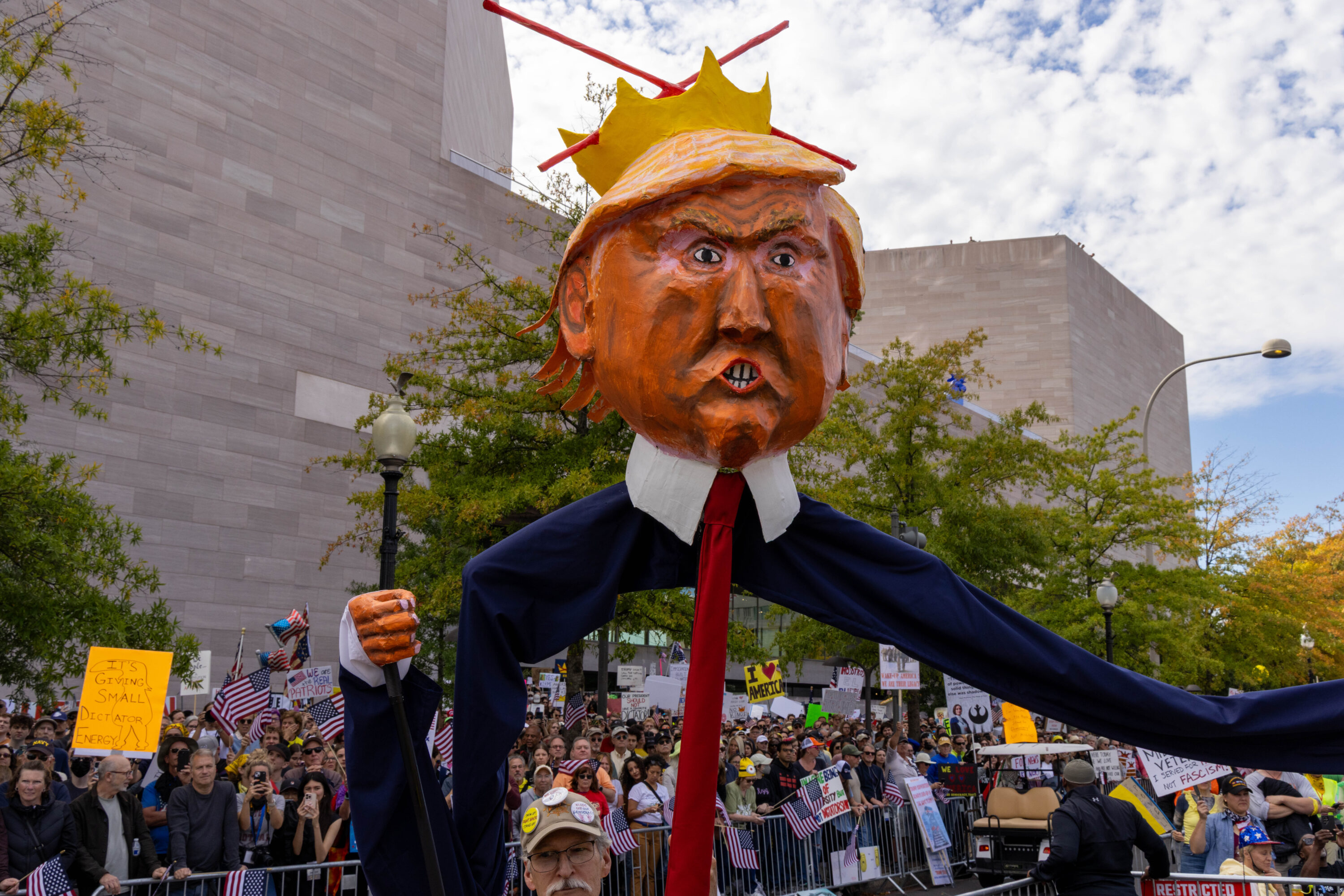 Carrying signs that were at times deadly serious (“Evil Wins When Good People Do Nothing,” “Stop Kidnapping People”) and other times mocking (“Cleanup on Aisle 47,” “Elect a Clown, Expect a Circus”), an estimated 200,000 protesters filled Pennsylvania Avenue and surrounding DC streets on Saturday, October 18, for the second No Kings day of action this year.