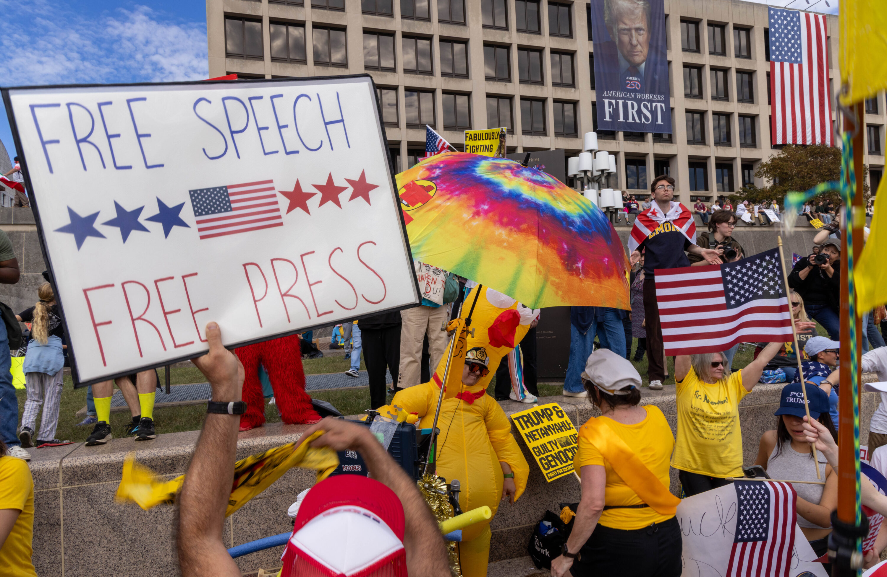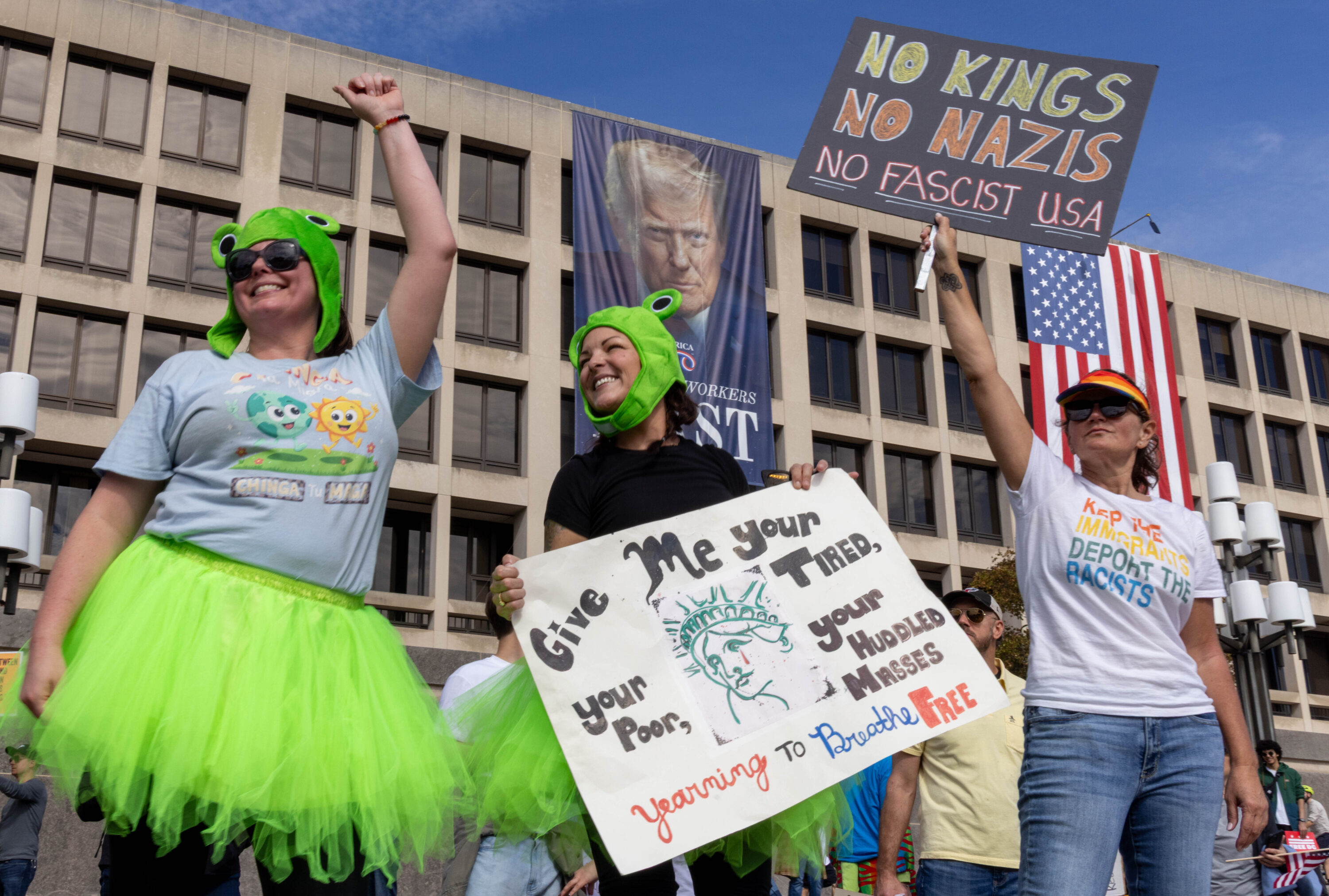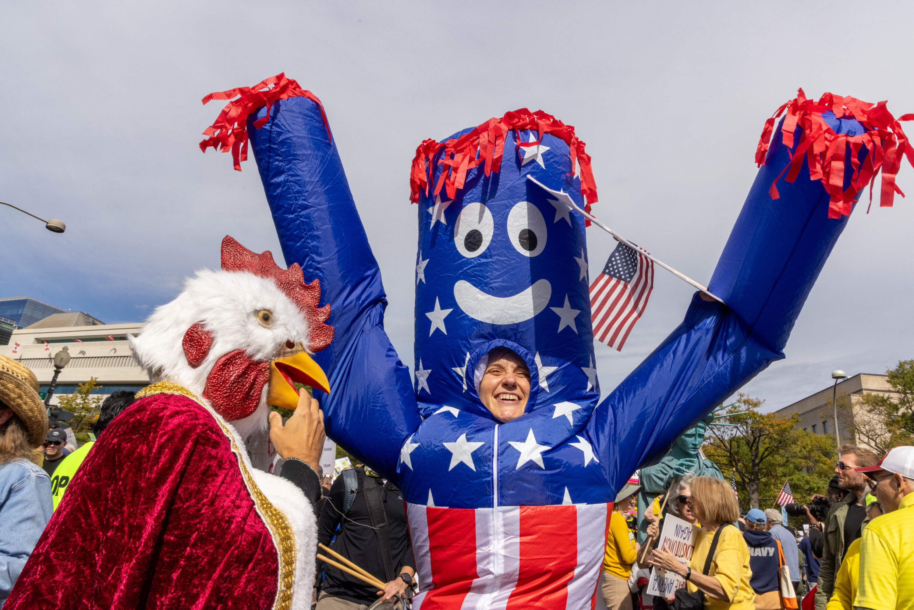 While speakers such as senators Chris Murphy and Bernie Sanders warned of the current state of affairs, and some participants broke into spontaneous chants about democracy (“the people united will never be divided”), the rally at times had a light-hearted, almost party-like vibe thanks to all the people sporting costumes—including “founding fathers” in powdered wigs and colonial garb, a massive Statue of Liberty head, and colorful inflatable get-ups such as unicorns, sharks, T-Rexes, frogs, a giraffe, and a Cookie Monster.